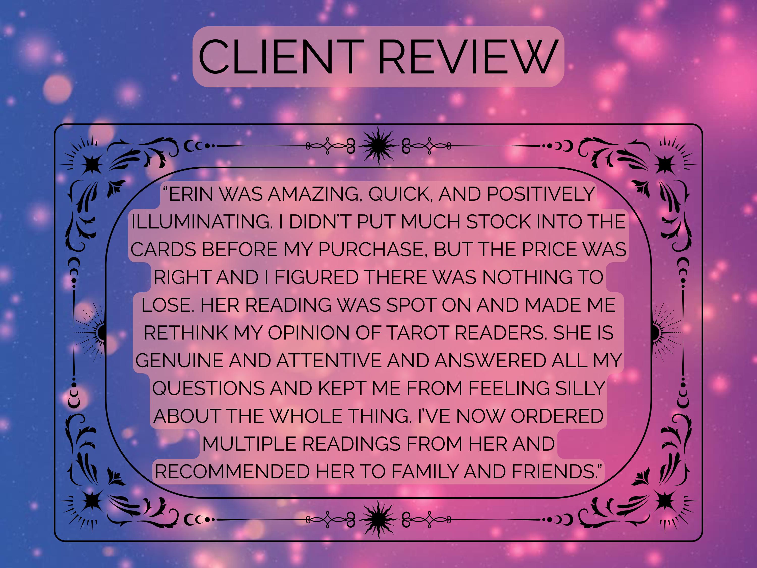 Your reading will be written with love, peace, and advice. All readings will be lengthy enough for you to feel as though you received a reading that addresses your questions asked and anything that shows through in the cards. I do not like to get short readings myself. I promise you will be satisfied with the length of your reading!